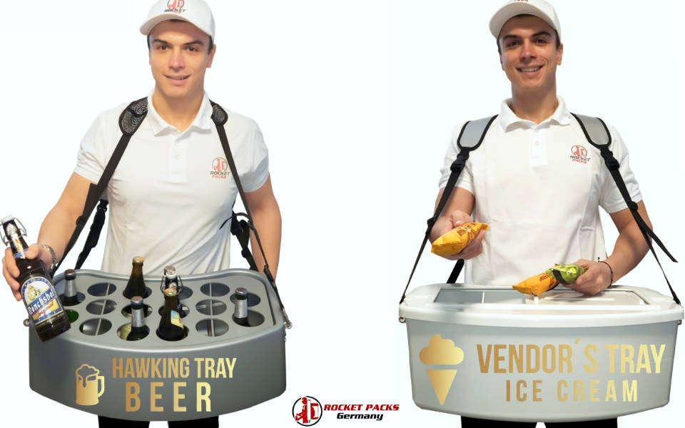 - Perfect for quick service in busy, crowded environments. The use of a vendor's tray or beverage backpack is particularly effective for distributing free drinks and brochures while placing various advertising messages.